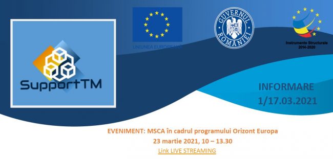MSCA în cadrul programului Orizont Europa 23 martie 2021, 10 – 13.30 Link LIVE STREAMING Comisia Europeană va organiza un eveniment de informare online referitor la Acțiunile Marie Skłodowska-Curie (MSCA).…